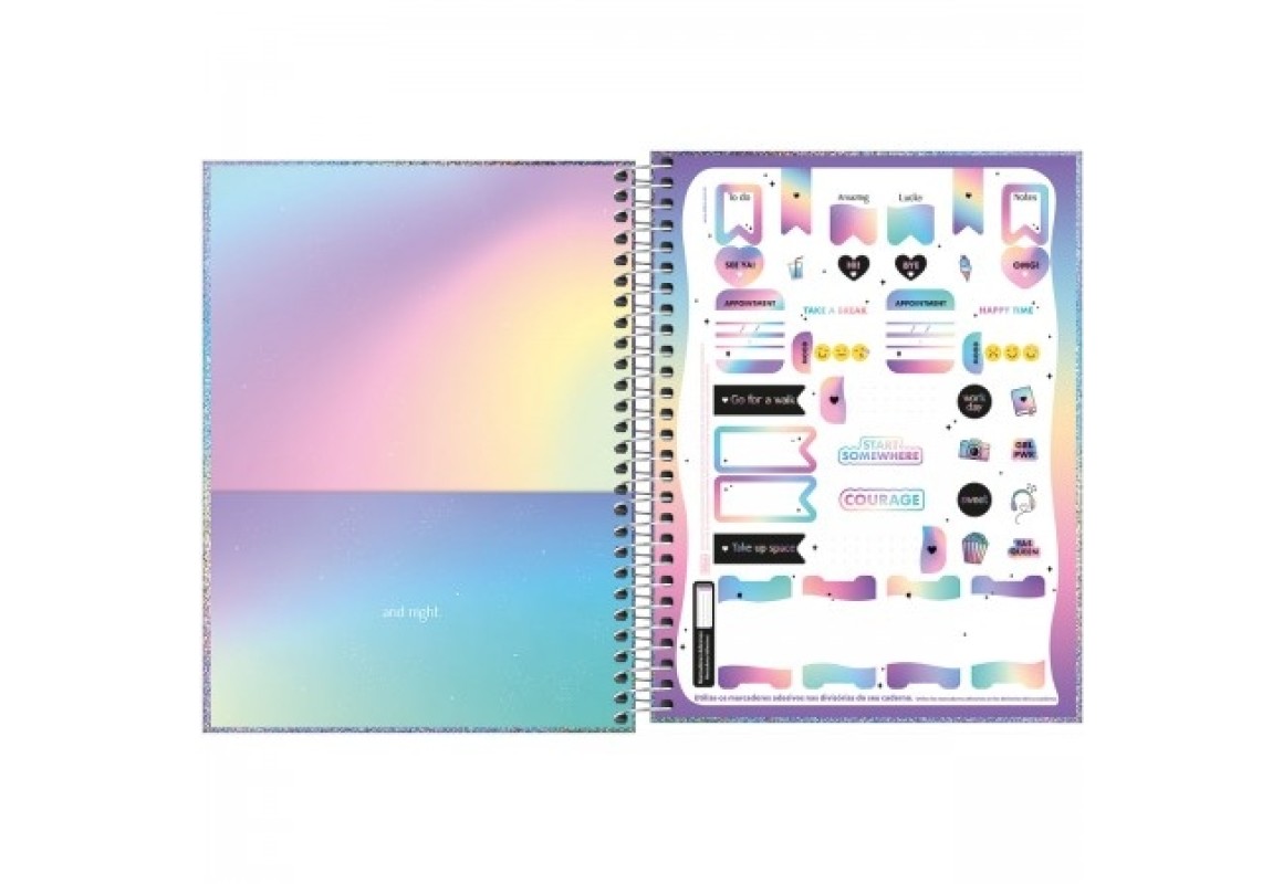 O Caderno Capa Dura Colegial Glow 1 Matéria 80 Folhas possui formato inovador e compacto, ideal para quem gosta de praticidade. Possui capa dura em material especial holográfico com detalhe metalizado, parte interna da capa decorada, bolsa de papel decorada para guardar trabalhos e anotações, folha com adesivos funcionais e folhas pautadas decoradas.