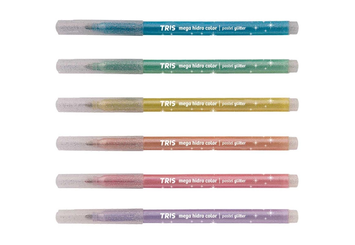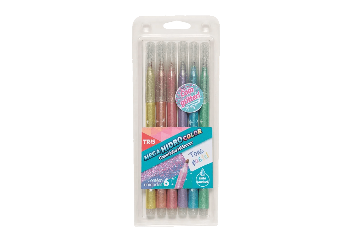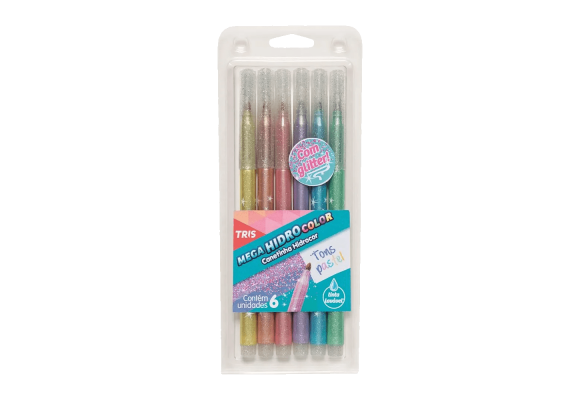 CANETINHA HIDROCOR GLITTER TONS PASTEL TRIS 6 CORES