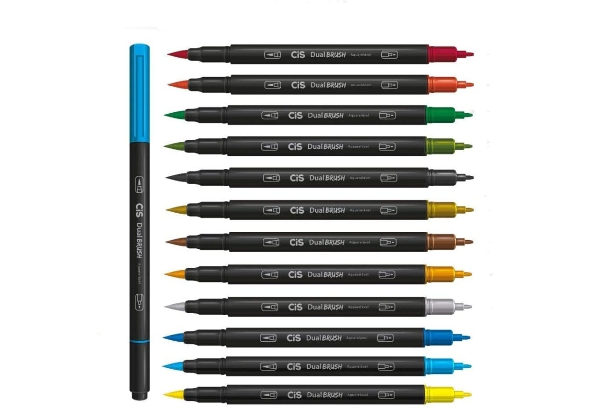 Marcador artístico aquarelável Dual Brush - CIS - Estojo com 24 unidades. Marcadores com 2 pontas uma brush e outra de feltro. Tinta a base de água.